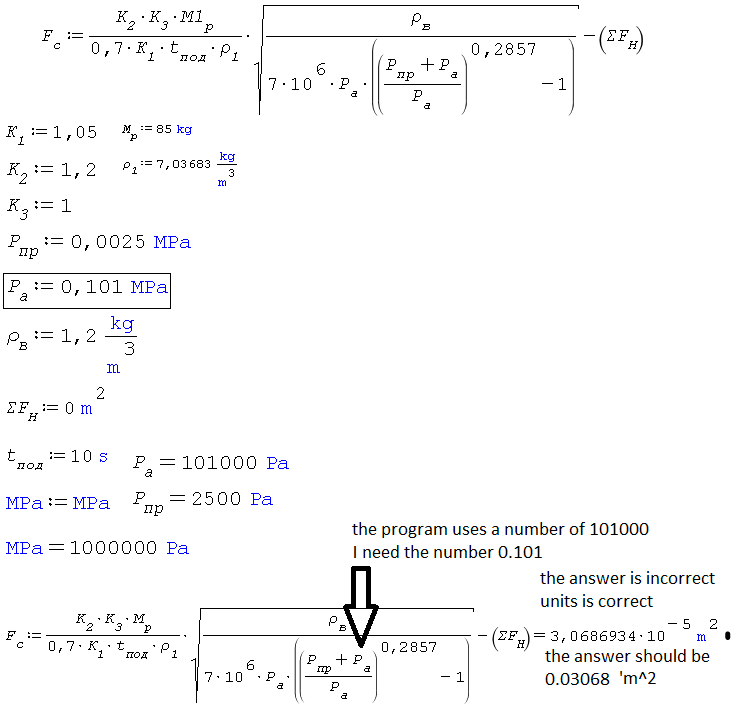 Often these types of formulas are made to be used with specific units as input... my thought is that the 10^6 used in the denominator is specifically provided to use P.a in MegaPascal as input, while the program uses the base units (the ratio under the arrow has P.a in either numerator and denominator, thus the magnitude doesn't matter here, unless you provide P.пр and P.a with wrong relative magnitude)