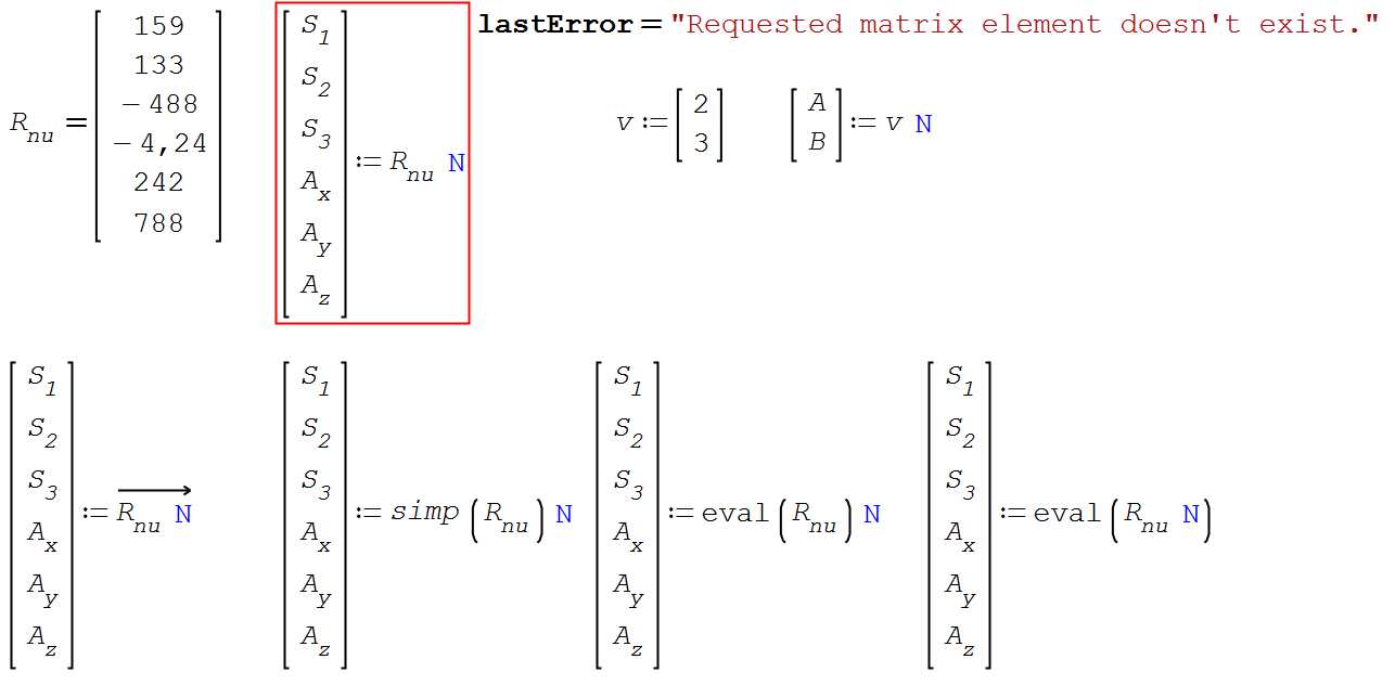 If there's a bug, it might be in the multiple assignment. Using an intermediate variable, you can see why the dimensions don't match. However, since SMath doesn't run the calculations unless explicitly requested with eval, it's not clear why it works with eval(R)*'N, when by that theory it should be eval(R*'N). In the following image, all the optimizations are numerical.
