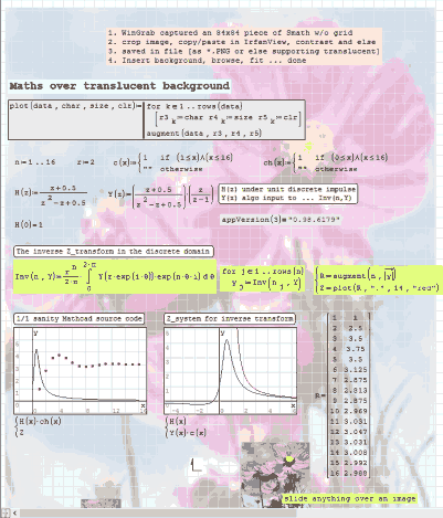 WroteI would like to suggest making the "background image" to function like IRFANVIEW "overlay/watermark".I need to make some backgrounds translucent and I cannot find how to do this natively in SMATH.Hoping the IRFAN code is available since it's free too