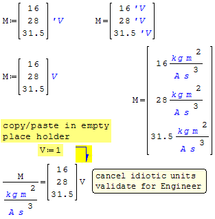 If a declare a Matrix : P28V with three values (16V, 28V and 31.5V) and I want to display the result, the unit will be for each result : kg*m²/(A*s^3)