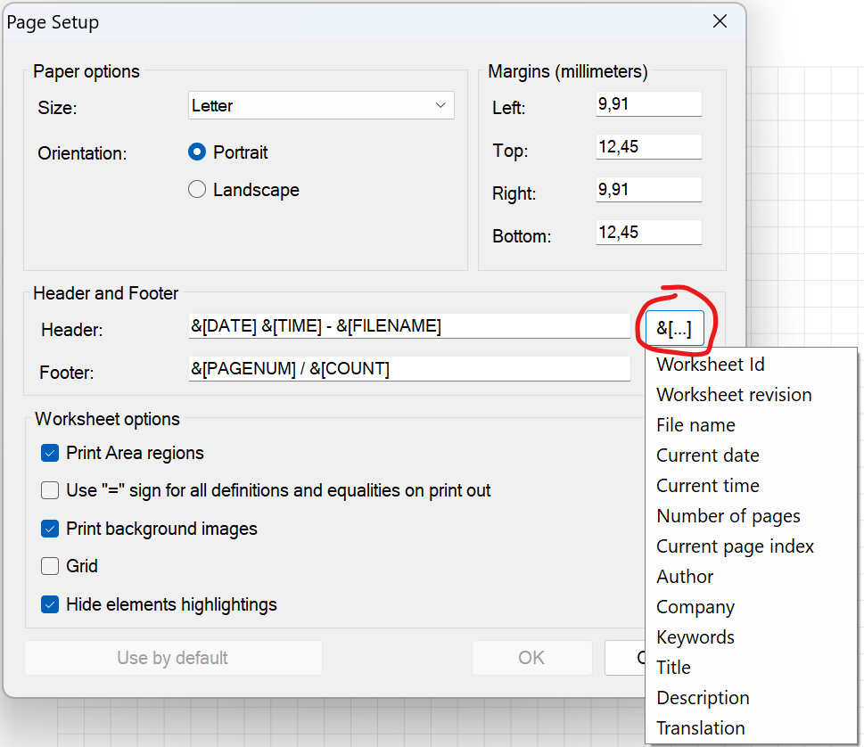 Page Setup dialog improved to allow selecting available substitutions from the dropdown lists for header and footer;