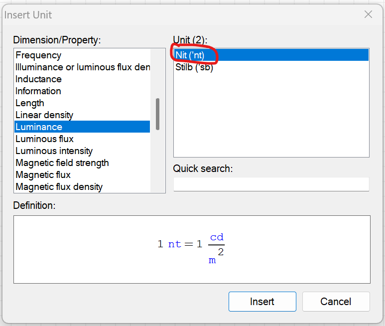 The non-SI nit unit of measurement added to the Luminance dimension;