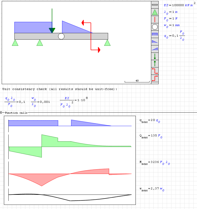 • separate diagrams for distributed load, transverse force, bending moment and displacement