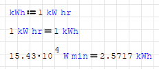 Wrotefor the kilowatt-hour, which is normally written as 'kWh', you'll need to use kW*hr in SMath.