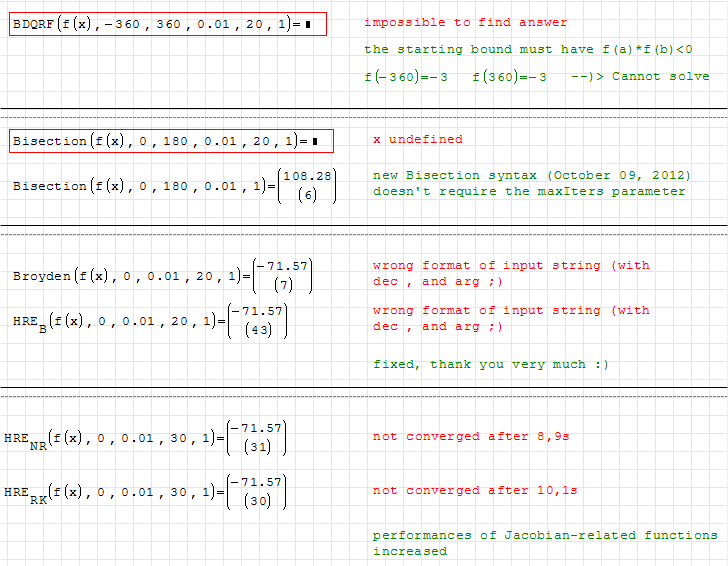 thanks again. I played around with the bracketed root finding algorithms based on your Bisection test file. The precision argument is either a number or a two element list, each element being again a number. I guess/propose that in further releases these elements might be lists, giving tolerances for the individual functions (first list) and for the variables (second list). Secant() is complaining about type of arguments.