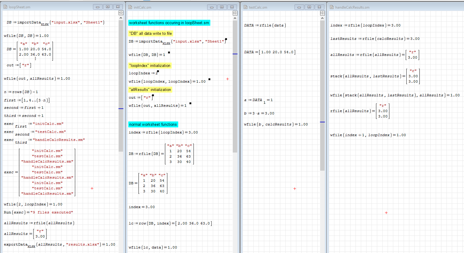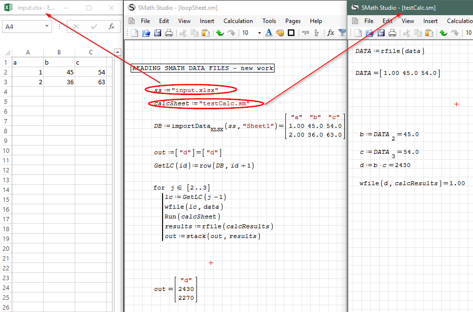 WroteI know in this case calcSheet.sm is not "calculating" anything. The whole problem we're trying to solve is looping a large data set through the calcSheet, row by row, which processes the data with whatever formulas we want, in this case it's 1*data my previous example actually took one of the values in the 'current row' and multiplied it by 3.I just wanted to make the example here as simple as possible so we could hone in on the problem.