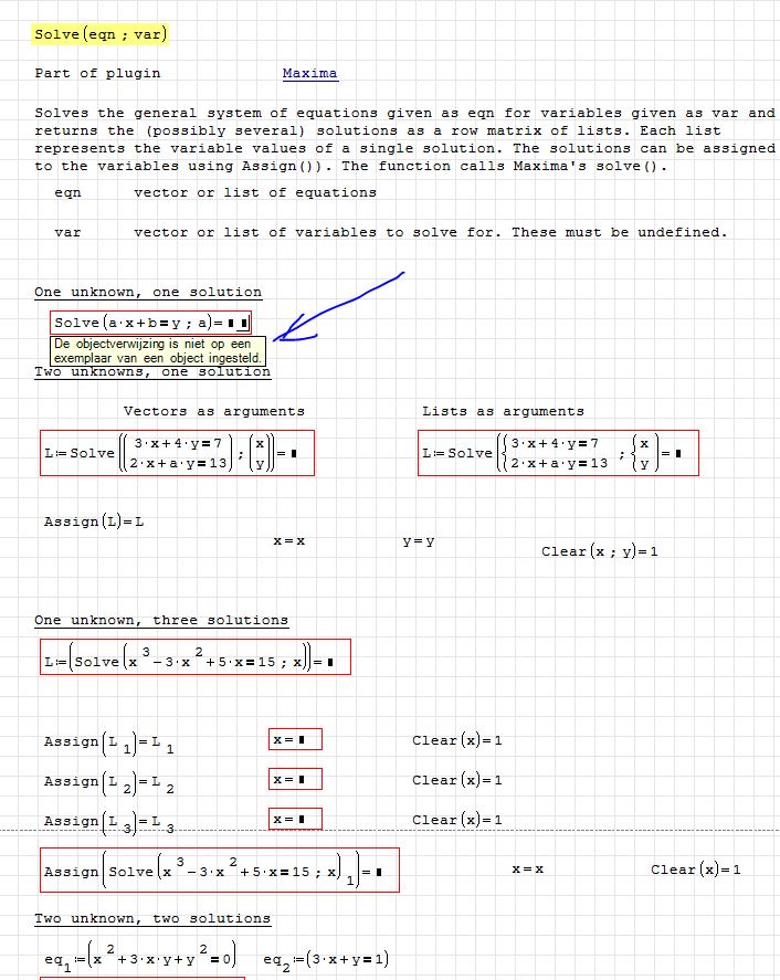WroteMany Thanks for the help sofar. I downloaded v14 + maxima en try to use the solve function, but I got the message as displayed in the enclosed file: