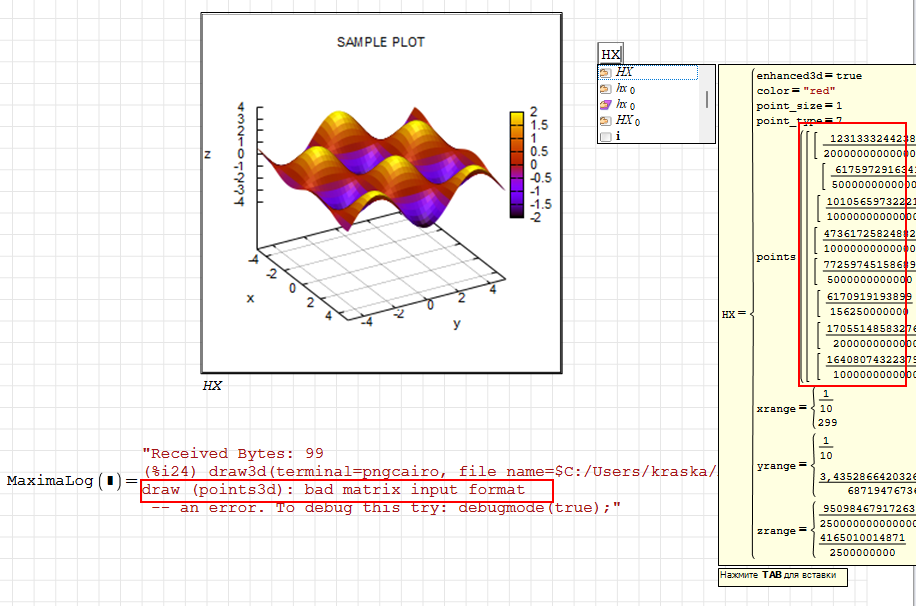 I’m back. I tried to create line of points by maxima handbook. Handbook is really great, but I couldn’t figure it out. What am I doing wrong? Matrix seems right.
