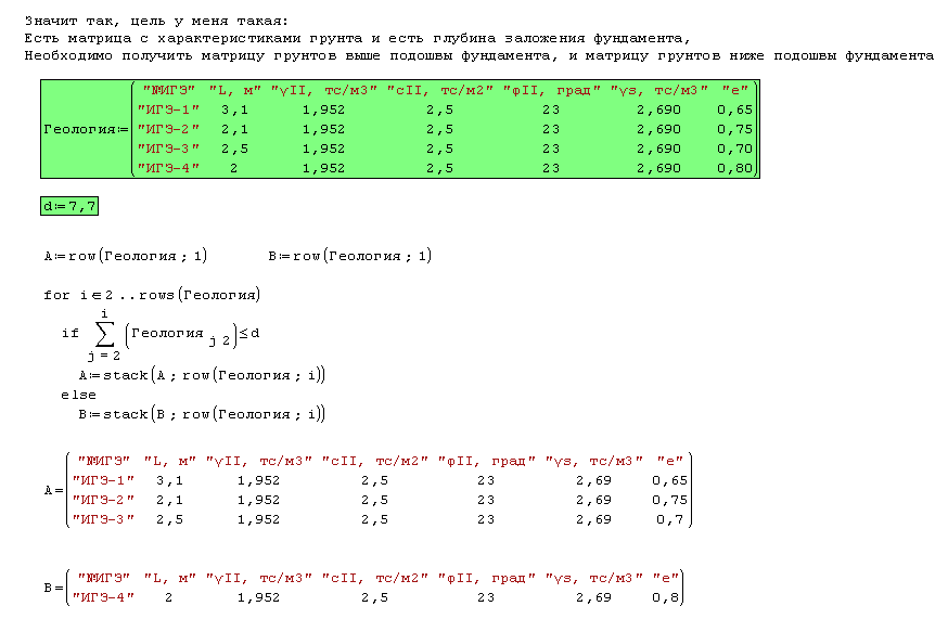 отредактировал картинку для большей наглядности в предыдущем посте (там есть исходная матрица - приведены только наименования слоев и глубины, а также матрицы которые должны в итоге получиться. представлены 3 варианта - может быть и больше при частом напластовании грунтов, или при большой глубине залегания фундамента). Смысл не только в определении в какой слой попала подошва фундамента и формирование матриц слоев ниже и выше подошвы фундамента, но еще и в вычислении глубин слоев, ведь подошва редко попадает на границу слоя