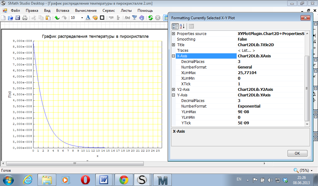 Уни, спасибо. Мой график как раз так и должен выглядеть, однако у меня файл не работает, т.е. программа выдает следующие ошибки при открытии (на скриншотах). Я удалил полностью предыдущую версию и установил 0.96.4902 со всеми плагинами. XYPlotRegion.dll уже был. Я открыл файл "График распределения температуры в пирокристалле.sm", но Вашего графика я не увидел, а своими силами я сделал график так, как на скриншоте. Подскажите, пожалуйста, где находится форматирование графиков и как Вам вообще удалось этот график построить? Я выбираю Вставка - График - Двумерный (2D), после чего в левом нижнем углу появляется пустой маркер, который надо заполнить. Согласно http://ru.smath.info/forum/yaf_postst26_Postroieniie-ghrafikov-funktsii.aspx в этот маркер надо вписывать саму функцию, т.е. выражение, стоящее справа от знака ":=". Мне стыдно уже спрашивать, но у меня, правда, с этим моим графиком ничего не получается. Получается только, если я задам в том маркере что-нибудь простое, типа "5*х".