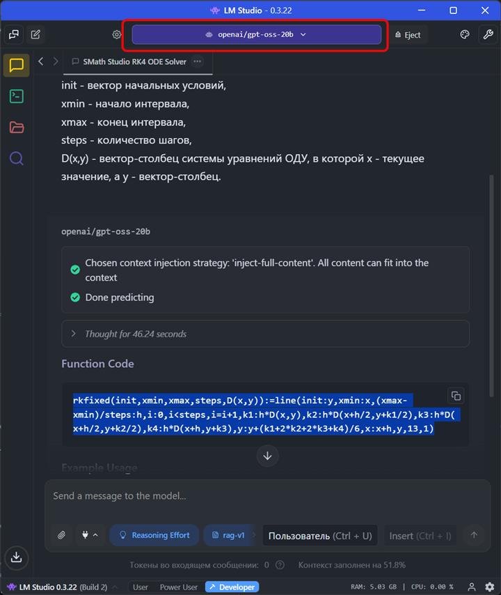New models have come out: gpt-oss-120b and gpt-oss-20b. I tried it locally. The test with forming an expression by syntax passes. I need to tweak the settings so that it thinks at an average level. I will continue testing.