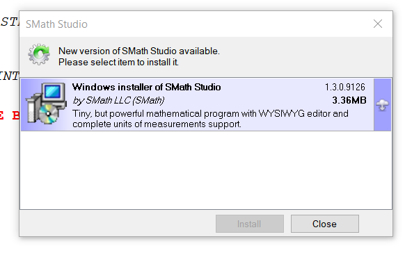 Should I uninstall SMATH and try to reinstall. It's been so long I have forgotten how to do that since I don't have the install file. When I select download on the update dialog box above, it does not tell me where the download is. It's not in my normal download location. So, I just installed it.