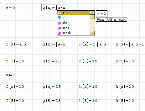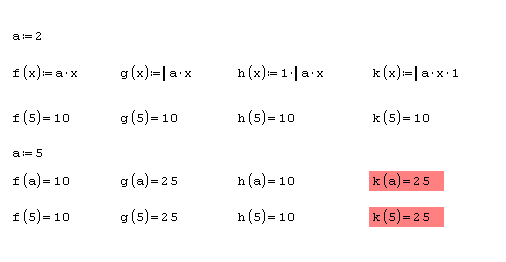 I'm not comftable with this. As shown in the picture, when write 'g', 'a' appears as 'a = 2'. Others programs have a warning message for the use of global variables locally. I think that you must to introduce a global command to catch the value of a in g(x).