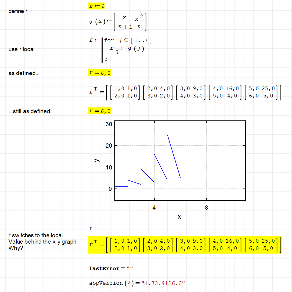 Форум SMath SMath Studio Bugs & Problems bug in x-y graph? 1 страниц (2 вхождений) bug in x-y graph? - unexpected value change - Сообщения К последнему сообщению #1 Опубликовано: 20.03.2026 13:11:26 Johannes Piel 2 сообщений из 20 понравились пользователям. Группа: User Hi everyone,I've noticed some strange behavior: a variable changes its value after the x-y graph is loaded.Maybe you could tell me if this is a bug or a feature...Best regards and have a great weekend!Johannes [xygraphBUG.sm (11,45 КиБ) скачан 21 раз(а). Отредактировано 20.03.2026 13:27:46 1 пользователям понравился этот постВячеслав Мезенцев 20.03.2026 21:25:04 #2 Опубликовано: 20.03.2026 16:51:56 Вячеслав Мезенцев 1 534 сообщений из 1 852 понравились пользователям. Группа: Moderator Yeah, it looks like a bug. The behavior isn't very good. I'll see what I can do. Russia ☭ forever, Viacheslav N. Mezentsev 1 страниц (2 вхождений) Новые сообщения Нет новых сообщений