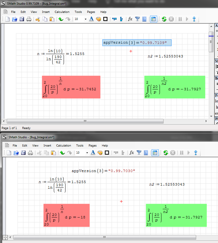 I have a simple integral calculation which contains a varable "n". If this variable is calculated in an earlier step, a wrong result is returned; the same calculation with a defined value for the variable (called "n2" in the example), the correct result appears. SMath Studio version 0.99, build 7030.