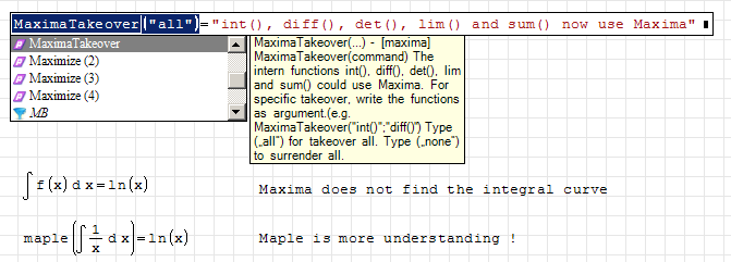 There seems to be a misunderstanding on how to use the CAS functions of the maxima plugin. The plugin can replace the built-in functions int(), diff(), sum(), lim() and det() including their operator representations. This, however, is disabled by default, you have to switch this on using the function MaximaTakeover(). There are some pitfalls in multi-document context, see the interactive handbook for details.