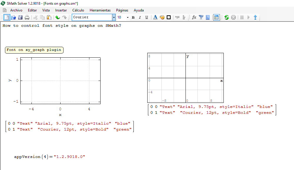 The point is that the text (monospaced) in the native SMath graphics is displayed correctly, but not in the graph plotted by the x-y graph plugin. There is no way to control which font is used for the text in the x-y plugin through the settings. It would be really amazing if you could choose which font you would like to use.