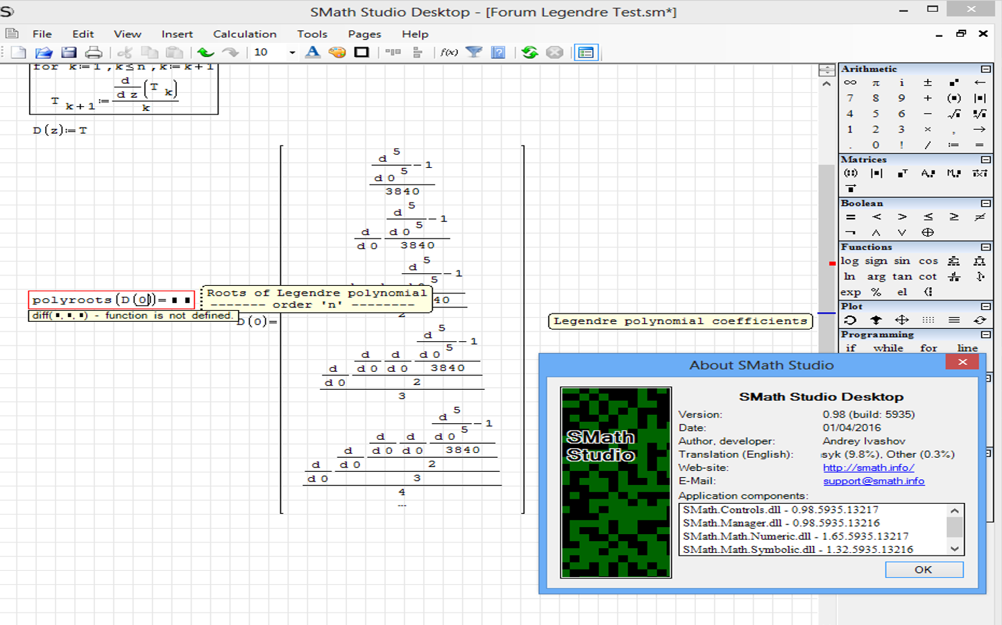 WroteYour "Forum Legendre Test.sm", file does not work correctly in the current version of SMath Studio that I have installed.