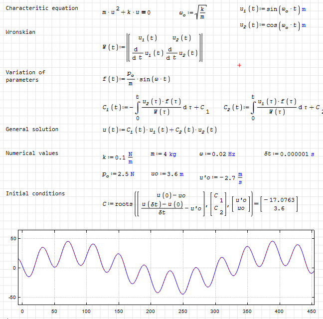 Plugin less solution, with units, using the Wronskian and the variation of parameters method.