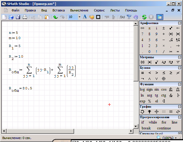 Но потом полученную сумму (т.е. электропроводность) нужно преобразовать в сопротивление, т.е. взять обратную ей величину. Поэтому результат суммирования возведён в степень [MATH]-1[/MATH]. Именно результат суммирования, это можно увидеть при просмотре формулы: sum(((R,2/k)^{-1});k;1;m)^{-1}. Это упустил mikka, когда отвечал Вам, но, по правде говоря, Вы должны бы сами находить такие огрехи, так что того, что Вам указали направление, уже должно быть достаточно. Кстати, OchkovVF совершенно резонно заметил, что это стало бы очевидно при использовании единиц измерения: программа не позволила бы суммировать сопротивление и электропроводность.