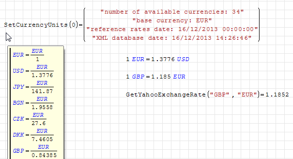 - SetCurrencyUnits(1), SetCurrencyUnits(2): extends SMath Studio with currency units. When an internet connection is available, exchange rates are kept updated using the ECB reference rates (internet connection not required but useful);Цитата
