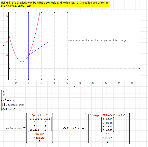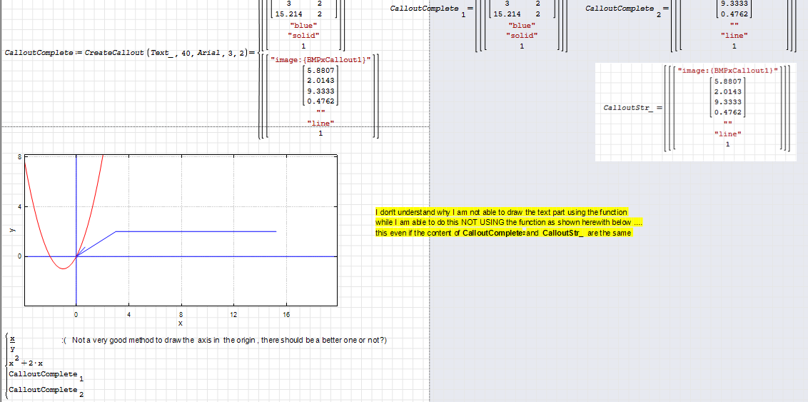 The critical part is in CalloutStr if I check its contents I see that it is equal to the content of the variable generated NOT using a function; this means that in this last variable to the symbolic variable name BMPxCallout1 are however linked real data ( the BMP matrix ) while for the variable CalloutStr ( output of the function ) to the variable name BMPxCallout1 is NOT replaced at runtime the real data that are behind its name and to renable this link I need to read the data from an external file where previously I have saved it ( and obviously the reading instruction MUST be outside the function itself ) at the worksheet level)