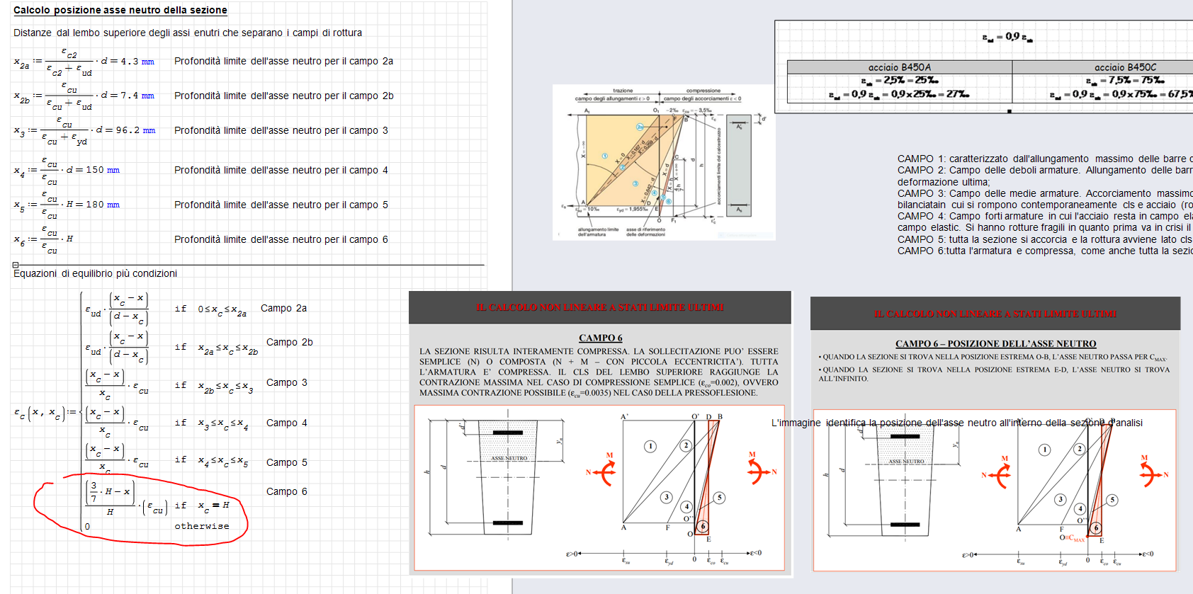 Credo che la costruzione dei domini M-N risulti più semplice con il metodo che veniva insegnato quando la velocità e la capacità dei calcolatori era inferiore. In sostanza si fissano delle coppie di valori di deformazione al lembo superiore ed al lembo inferiore (o all'altezza dell'armatura più tesa). Tali valori sono scelti proprio prendendo i valori che delimitano i 6 campi di rottura più alcuni punti interni (alcuni valori tipici si possono ricavare da alcune pubblicazioni ma sono sostanzialmente a scelta e più coppie consideri e migliore sarà la rappresentazione). Diventa subito facile calcolare l'asse neutro dalle due deformazioni (come hai fatto per x2, x3 ...) e le deformazioni in tutte le altre armature. Dalle deformazioni ricavi le tensioni entrando nelle curve dei materiali. Infine dall'equilibrio alla traslazione e alla rotazione ottieni (anche usando l'integrale come hai fatto tu nell'equazione dell'asse neutro; ma in questo caso l'asse neutro è fissato) una coppia di valori M e N da usare per tracciare il diagramma. Ripeti per tutte le coppie di deformazione fissate.