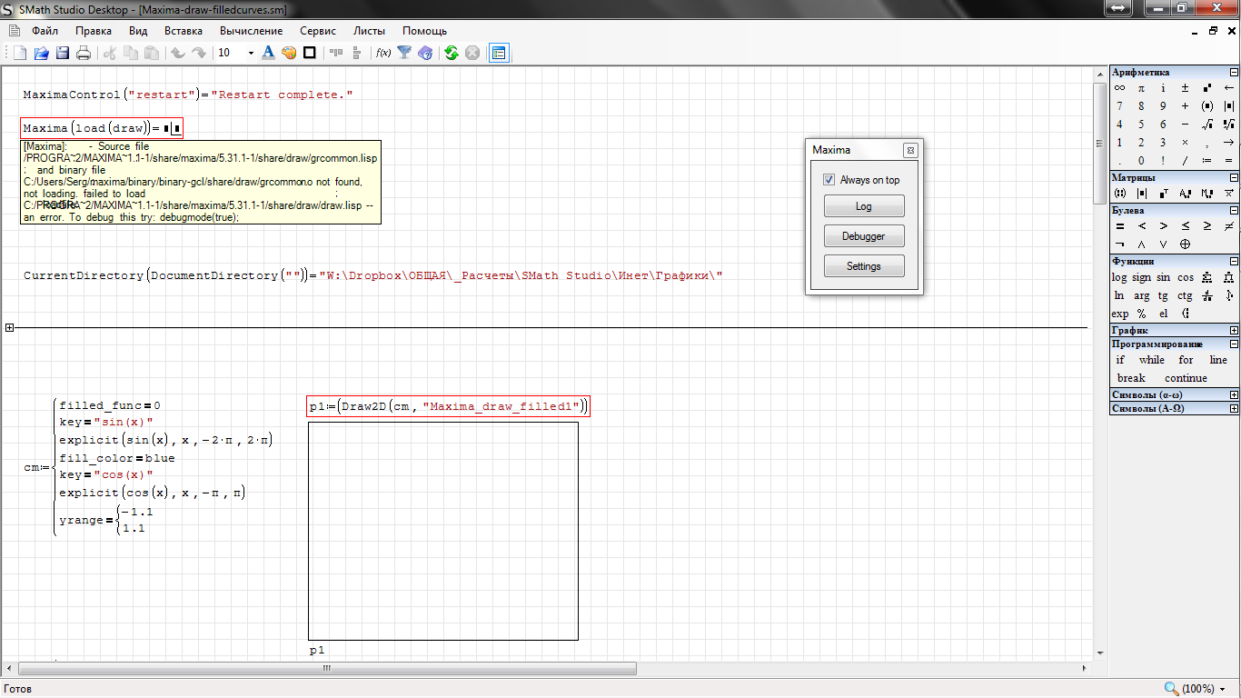 2. Запустите программу wxmaxima (часть установки Maxima, будъе осторожны чтобы запускать правилную версию) и там исполните комманду load(draw). Если это успешно, то есть надежда что работатет и в SMath.