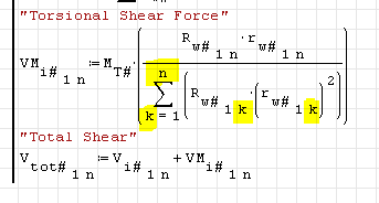 The problem is in the sum under "Torsional Shear force". The sum in the denominator runs from 1 to # of columns in your data matrix. However, the quantities under the sum are known only up to current n. If you replace n for the upper sum limit then you get a result. However, I don't know if that is what you want.