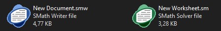 Both applications supports their own file formats: Solver - *.sm, Writer - *.smw. If you have created Documents in SMath Studio using previous program versions please just change an extension manually.