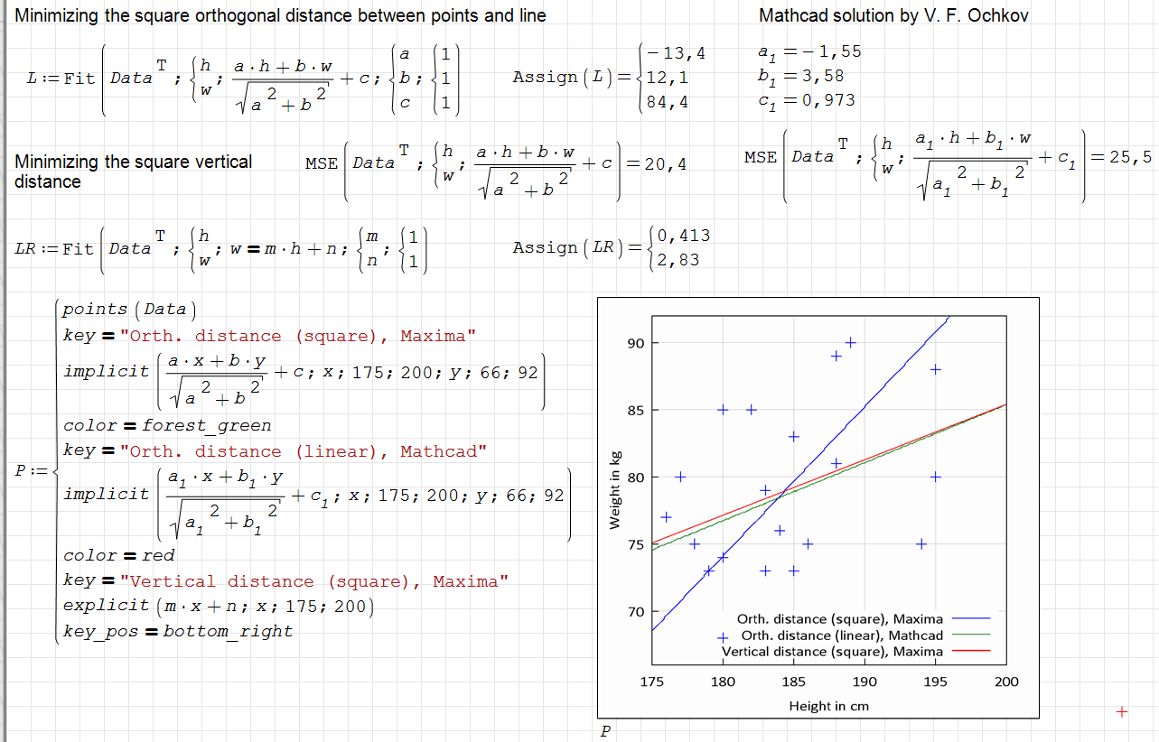 Here is a version with Maxima Fit(). Note that Fit() uses a least squares procedure, whereas Mathcad obviously directly minimizes the average linear distance between data points and model.