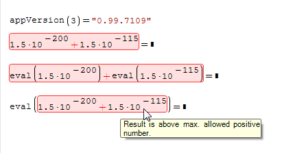 The main problem here is with the rather small numbers close to zero. I think that lots of calculations will fail if we deal with the numbers which have practically zero values because of the errors SMath will popup and stop calculations. I think this behavior can not be acceptable.