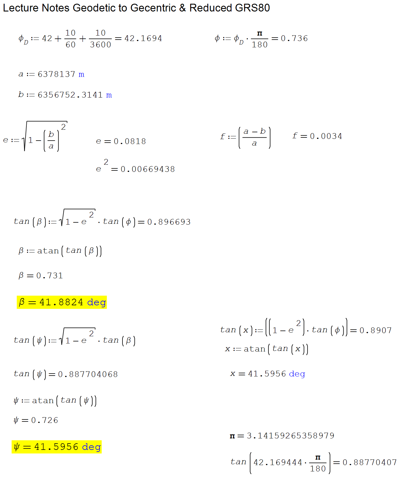 I have been having trouble for a while with the trig functions. Please review my attachment (geodetic_to_geocentric). In the following worksheet, the psi result near the bottom is incorrect, so I used an equivalent formula to cross check the result (using "x"). The results matched exactly, but incorrectly. So, I decided to check the value of pi and then compute the tangent of the angle shown. As you can see, the result is not correct. Lastly, I opened a new worksheet (trig_test) and it produced the correct result.