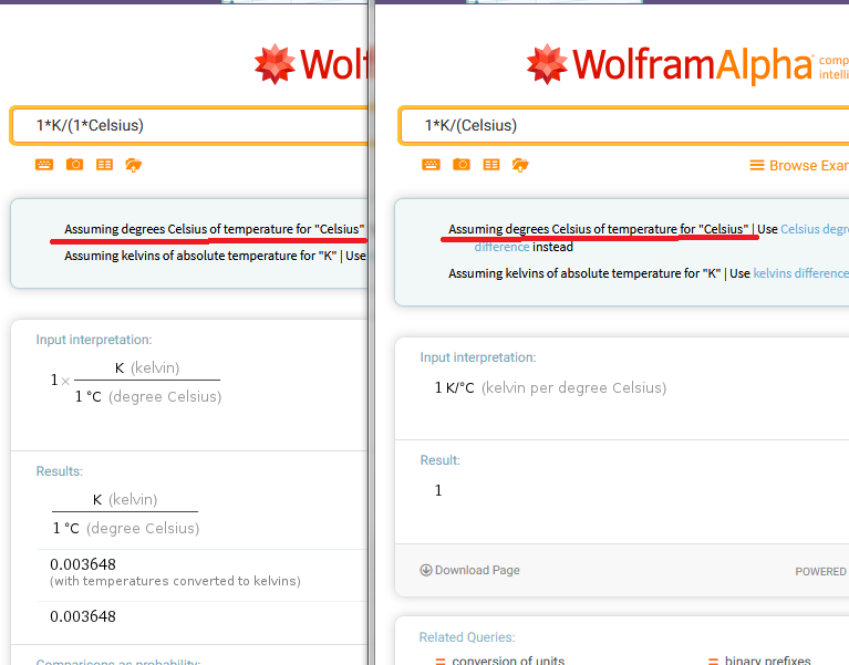 Interesting. I would think these both should compute to the same value since WA says they are assuming temperature in degrees Celsius and not delta temperature.