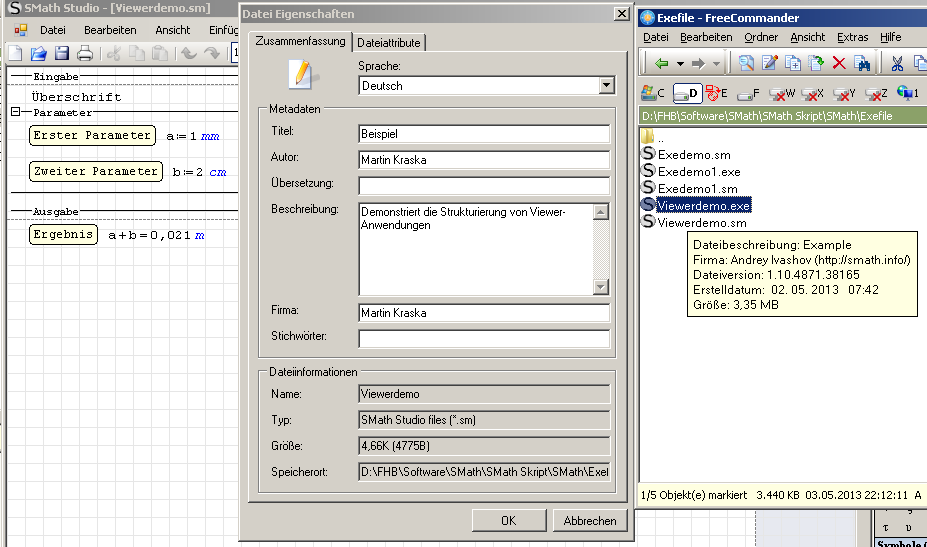 As for the metadata: I entered german and english metadata. The german title is "Beispiel" and goes to the window title of the Viewer window (with "- SMath Viewer" appended. The english title goes to the exe file metadata as displaed in the dynamic info pop up (mouse hovering over exe file). Author name and company are set in both languages but have no effect.