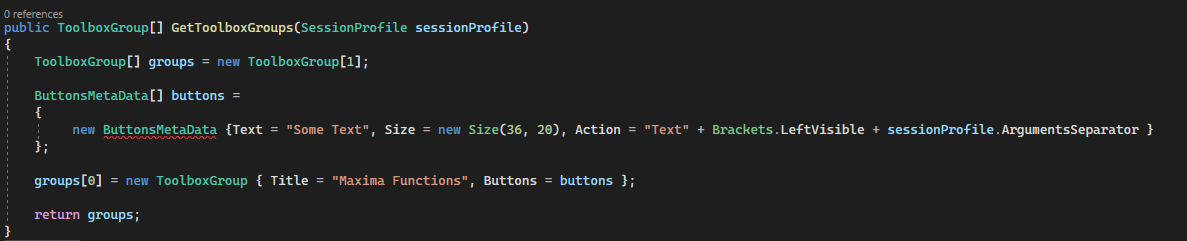 Error implementing ToolboxGroup for the maxima plugin - "ButtonsMetaData.ButtonsMetaData()" is inaccessible due to its protection level - Messages