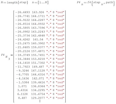 WroteHi. For your particulary method of defining path, you need to evaluate f4 for t=tStart for get the first row of path. Further, for the second t=tStart+1*DeltaPhi you get a two rows path. For the last, you can use this: