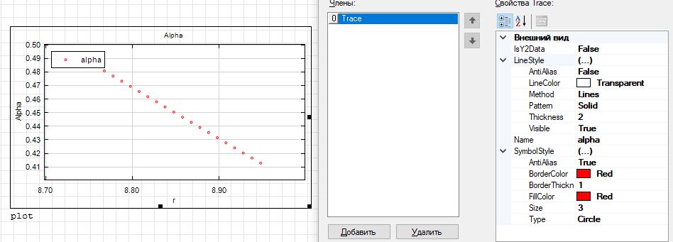 Hi Reg. In addition to Gerry's observation, by double clicking on the XYPlot, in the "traces" menu, "Visible" is set to "False". The "Visible" property must be set to "True". I don't know how to configure the graph to only show shapes without the line that joins them, without modifying the argument with augment( alpha , "o" ) or something similar.