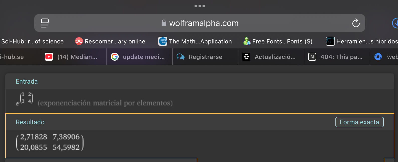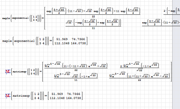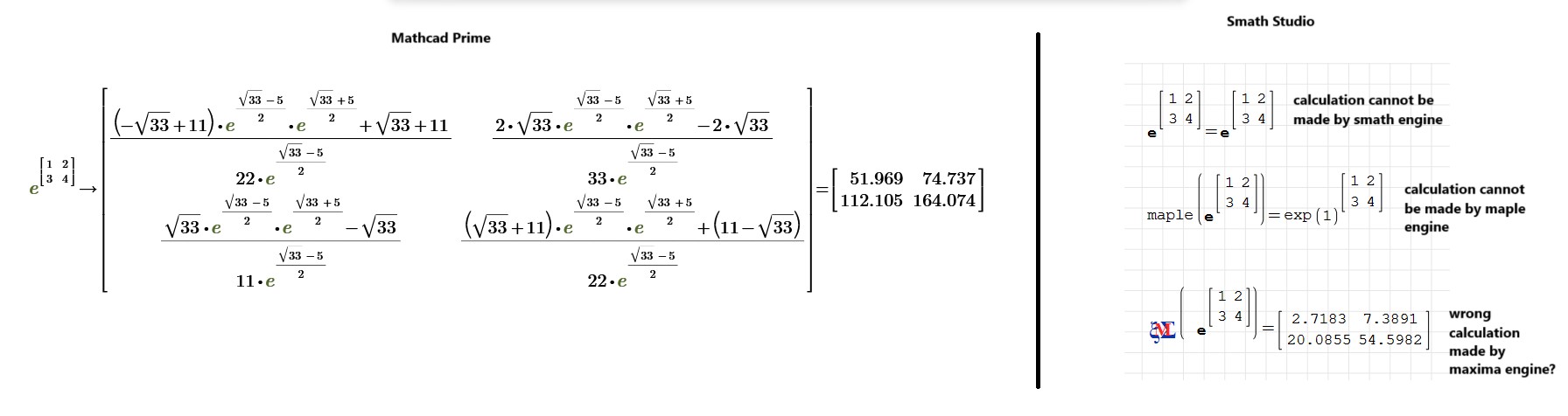 WroteIn general, the other CASs have special functions for this extension of the exponential function: expm in matlab, MatrixExp in wolfram mathematica, exponential in maple and matrixexp in maxima, which you can access from SMath: