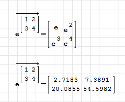 WroteHi Cornel. The exponential function is a well-defined function from the complex plane into the complex plane. A possible extension to its domain and range being square matrices analogous to the ordinary exponential function can be defined as e^A = sum(A^k, k=1...infinity). And notice that this is valid only for square matrices, not for the general case.