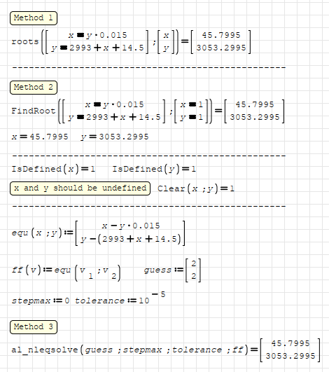 how to get the result of x, y without using the matrix? I tried solve and findroot, but can't get the value of x, y.