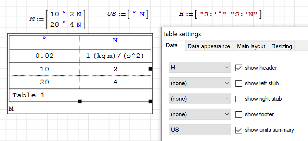 The table region provides some extended options. There you can specify column or row units but you have to write them explicitly to the header if you want a nice display of column units.