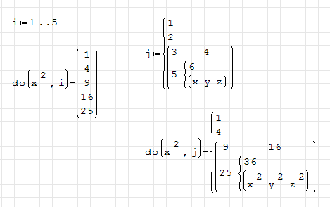 2. Implicit loops to generate matrix or vector results. Input is the index equation or it's parts (result name, expression, index names). I failed to provide a working example, the definitions might illustrate, what I mean.