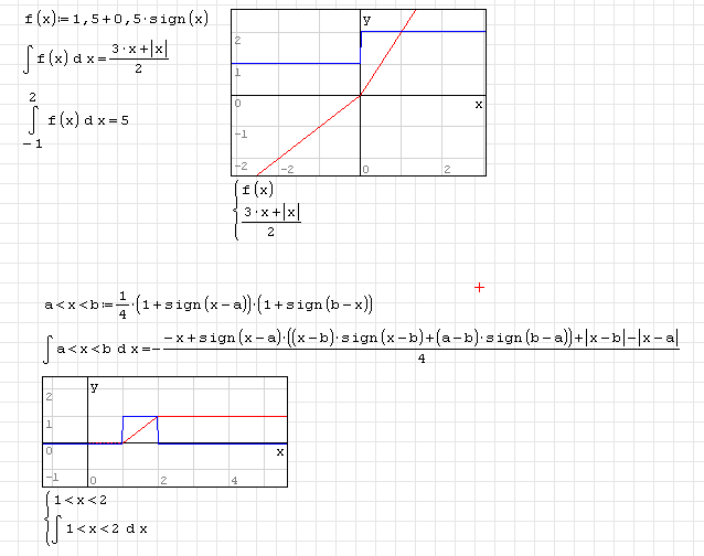WroteThere is still quite something to do until we can symbolically integrate functions involving your operators. Maxima can do that only if the cases expand to sign() and abs() or possibly unitstep(). Perhaps we also could split the integrals appropriately at the interval limits and send the individual functions to Maxima.