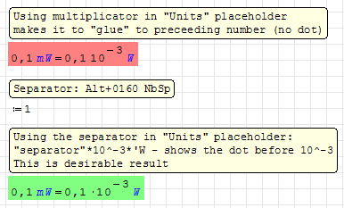 Using a leading multiplicator (like, say, 10^-3) in a Units placeholder makes the resulting display "wrong": there is no "multiplication" sign between the result number and multiplicator.