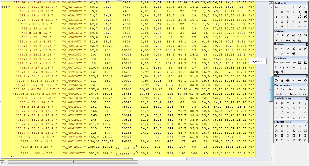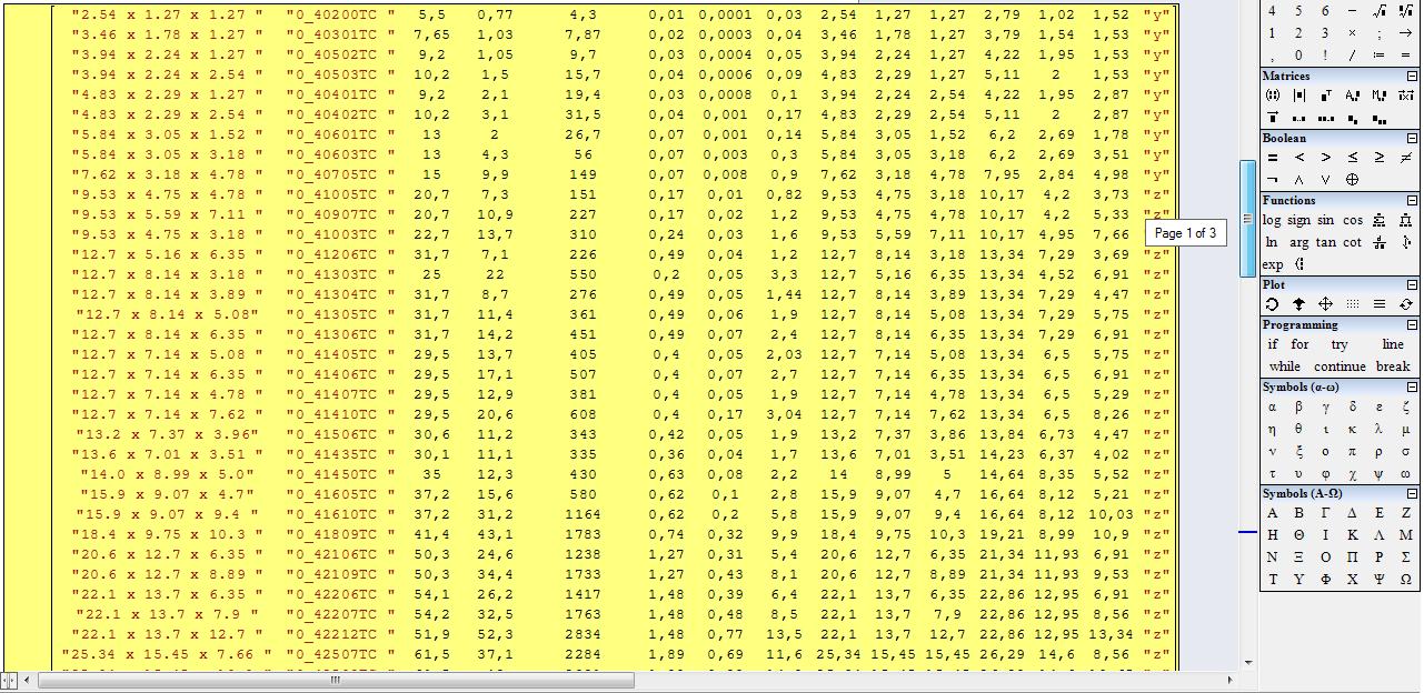 16 million is ... wow! However, MathCAD tables are available for input data storage and can then be reduced to the minimum space required. Even in such cases, collapsible areas are useful. I used them there as well. What I was saying on a different subject somewhere over tens of pages, actually referred to the un-collapsed workspace. I am now trying to get out of MathCAD's patterns, while still adapting the possibilities of SMath to my skills already acquired over time.