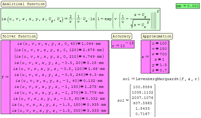 I continued the tests and wanted to see how SMath could lead. I have tried to define the function in a recurring way, as in the attached picture. The first observation was (as in the other test) that for more distant values of the Ug parameter the algorithm gives errors. Then, although I was able to solve a system of 18 equations (even 19 in one of the attempts), the increase of the number over 20 is also accompanied by errors. A sign that the solution is close to reality is the value of the variable from the exponent, which is naturally very close to 1.5. I think the convergence criteria should be strengthened for the LM algorithm in SMath. Although I have succeeded in introducing several equations in the calculation, however, the result of the first test was better. This is because the equations in that case have been selected based on the results already known to me in MathCAD.