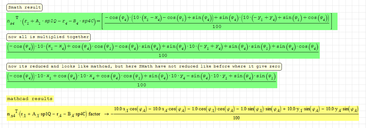 I reduce it myself, when i expand theupper equation, show as number 2, i can reduce it because like before som gave zero, but here they dont be reduced by SMath, and the last of the green is reduced equation and give the same as mathcad. I dont expect you to solve or try this of i only ask because i find some differences i need to find out why, (and offcause it can be easier to have the script to look. i do that another time), and i look at this and thx :-)