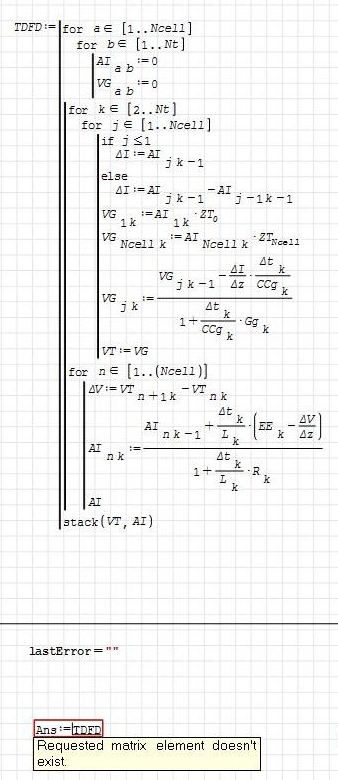 Are there instructions anywhere on how to use the debugger window? I have an attempt at a complicated coupled time domain finite difference routine (image below)that does not show an error in the routine when I run it, but the result show an error as noted in the image. All necessary parameters are defined above the routine in the full code. I will be happy to provide the full code, but I will have to restructure it to make it simpler and I would need to provide the txt file which it reads. As you might guess from my previous posts, this routine works in Mathcad. I am trying to convert to SMath.