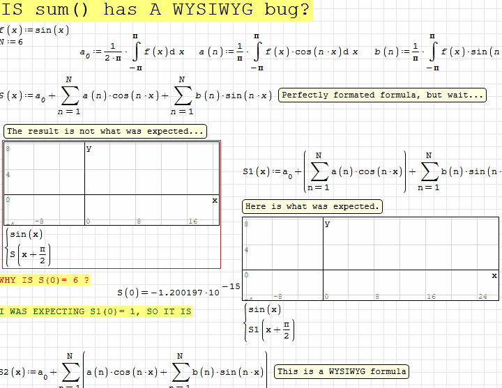 Hi. I don't see a bug here, but some kind of issue handling n. About the WYSIWYG notation, it's well know this kind of difficulties not only in SMath, but in mathcad, maple and mathematica too. About the issue with n it must to be solved using Clear, because n isn't local in the sum.